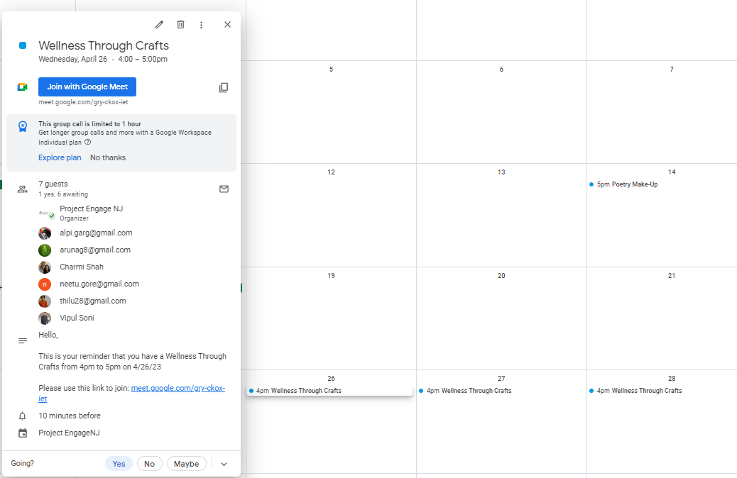 All classes are taught over Google Meets. Once registered for a class, a code for the class at a specified date and time will be emailed to your email address. To join a class session, either click on the Google Meet link or enter the Google Meet code to join. Each class ranges from 5-25 students and is a great way for younger students to connect with their peers and have fun!